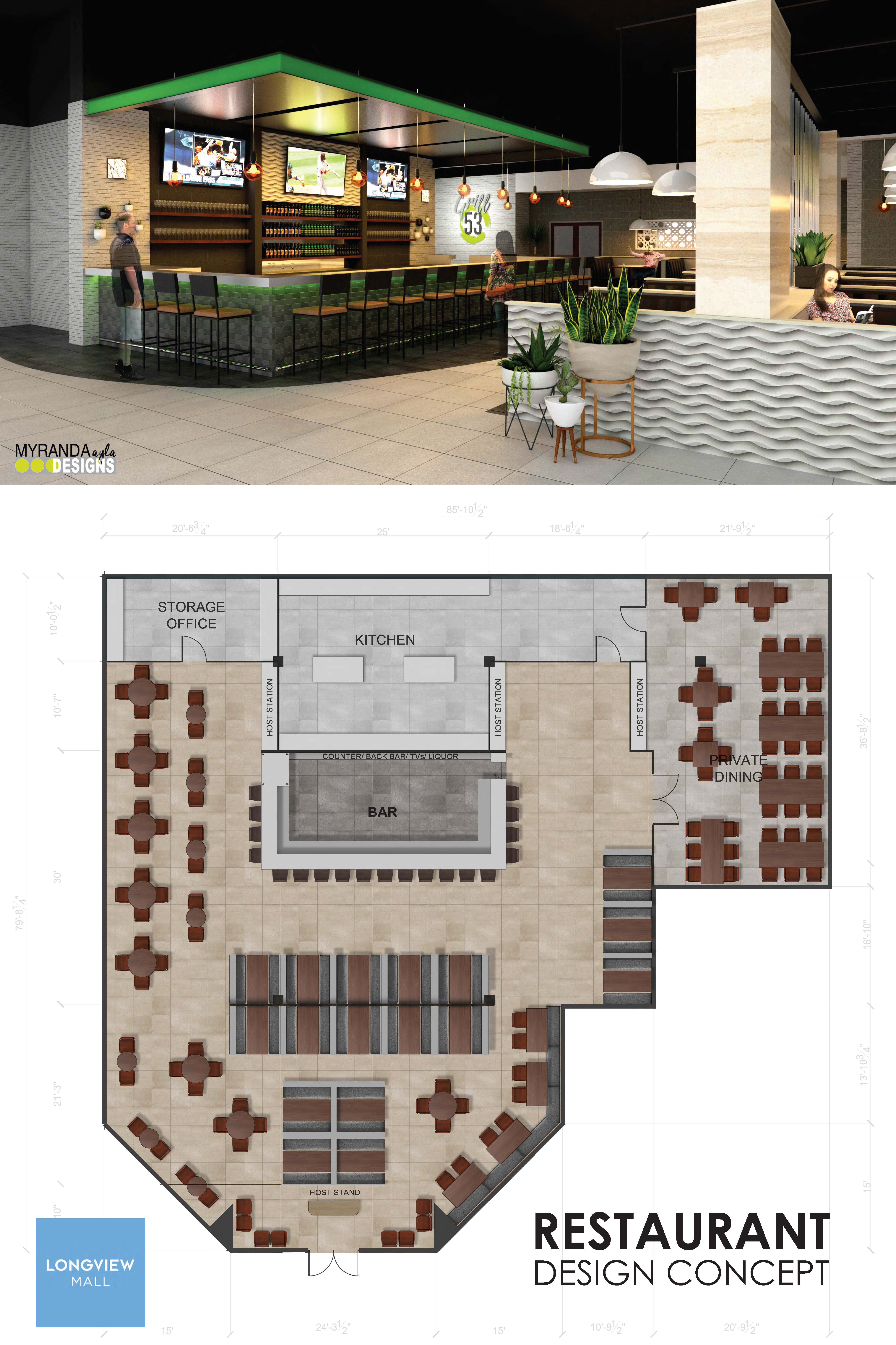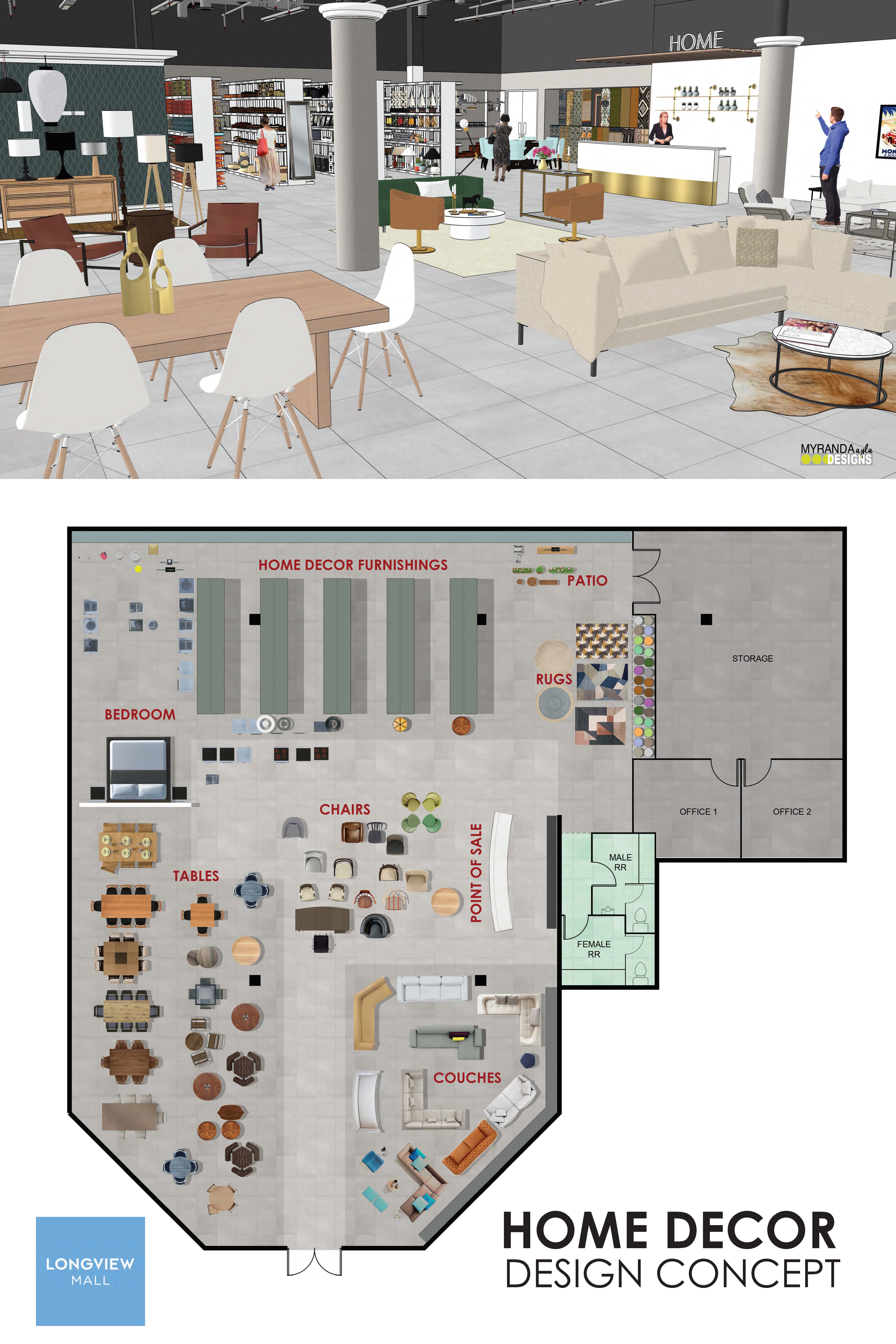 Longview Mall had a vacant anchor space in the mall that was absolutely gorgeous and spacious. They wanted three concepts that they could present to investors, franchisees, developers and the public to give them ideas and a visual of the space. We came up with three concepts: restaurant use, an event center, and a retail store.