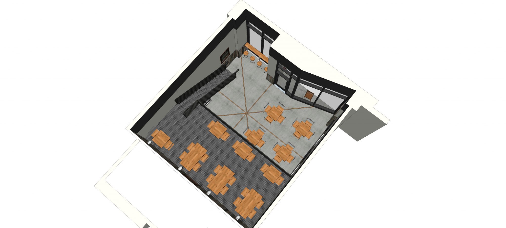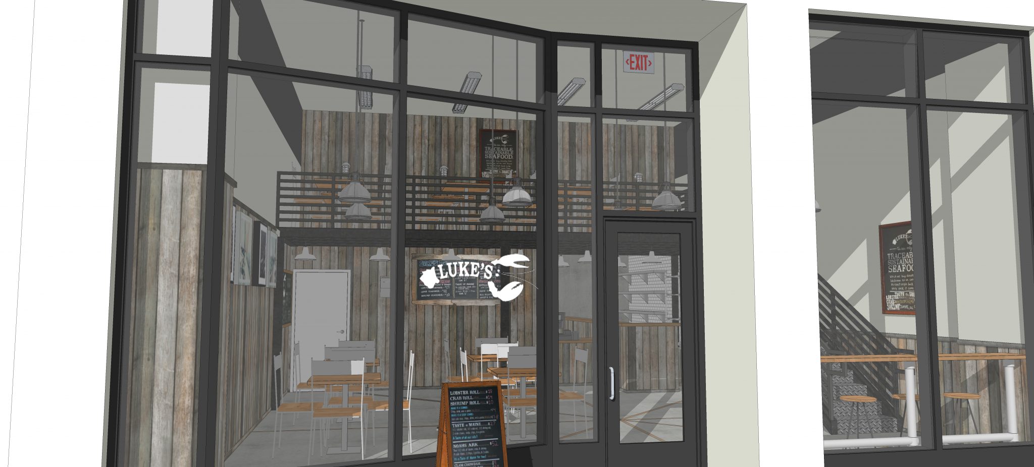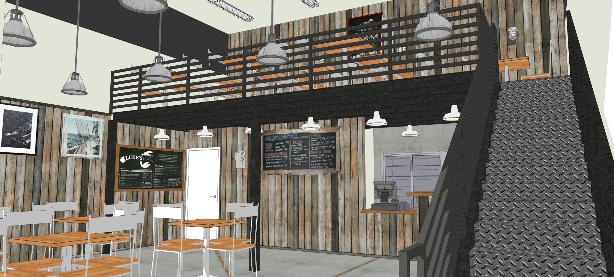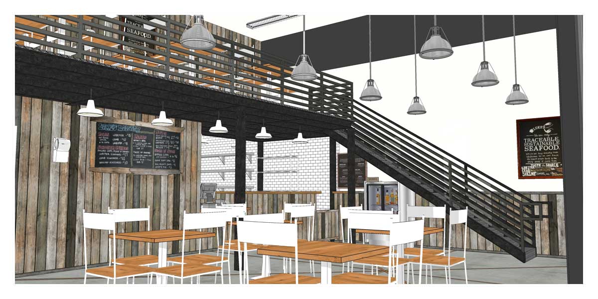 Our client was looking for a design concept of Luke’s Lobster branding standards inside of an existing space. We provided a model to give them a visual representation of their space with the furnishings, lighting, equipment, furnishings, signage and existing landlord conditions demonstrated in the rendering.